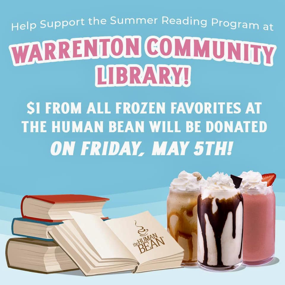 The Human Bean Warrenton is hosting a fundraiser for the Warrenton Community Library on Friday, May 5. They’re donating $1 from all Frozen Favorites to help support the Summer Reading Program.
